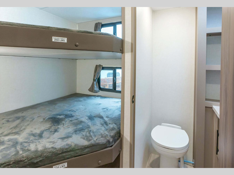 Sleeps 9 Slides 1 Ext Width 8 ft Ext Height 10 ft 10 in Int Height 6 ft 6 in Interior Color Chocolate Fresh Water Capacity 45 gals Grey Water Capacity 32 gals Black Water Capacity 32 gals Tire Size 15" Furnace BTU 30000 btu Number Of Bunks 4 Available Beds Queen Refrigerator Type 12V Refrigerator Size 10 cu ft Cooktop Burners 3 Shower Size 30" x 36" Number of Awnings 2 LP Tank Capacity 20 lbs Water Heater Type On Demand Tankless AC BTU 13500 btu Awning Info 10' & 14" Power w/LED Light Strip Axle Count 2 Number of LP Tanks 2 Shower Type Standard Electrical Service 30 amp Similar Floorplans